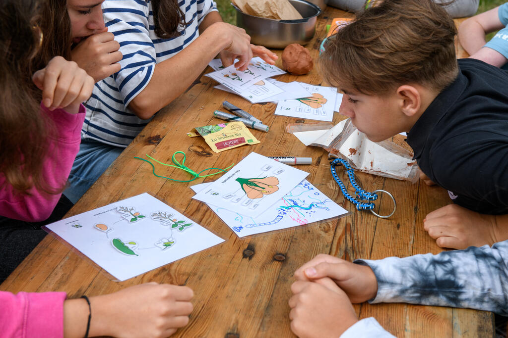 Colonie Nature, 12-14 dans le Lot à Vayrac, L’ ateliers Bombes à graines annimé par Agathe de cultures en ville, dans le cadre des Act’ Ethiques. Ce petit jeu conciste à remettre dans l’ ordre le cycle reproductif d’ une plante.