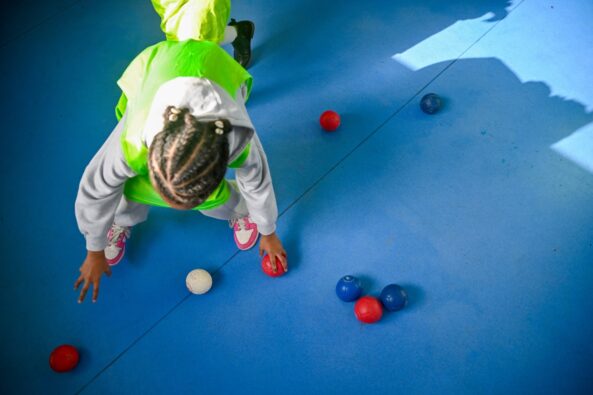 La boccia est un exercice de précision et de stratégie. Face au cochonnet blanc, les enfants lancent les balles rouges et bleues, découvrant une discipline accessible à différents handicaps.
