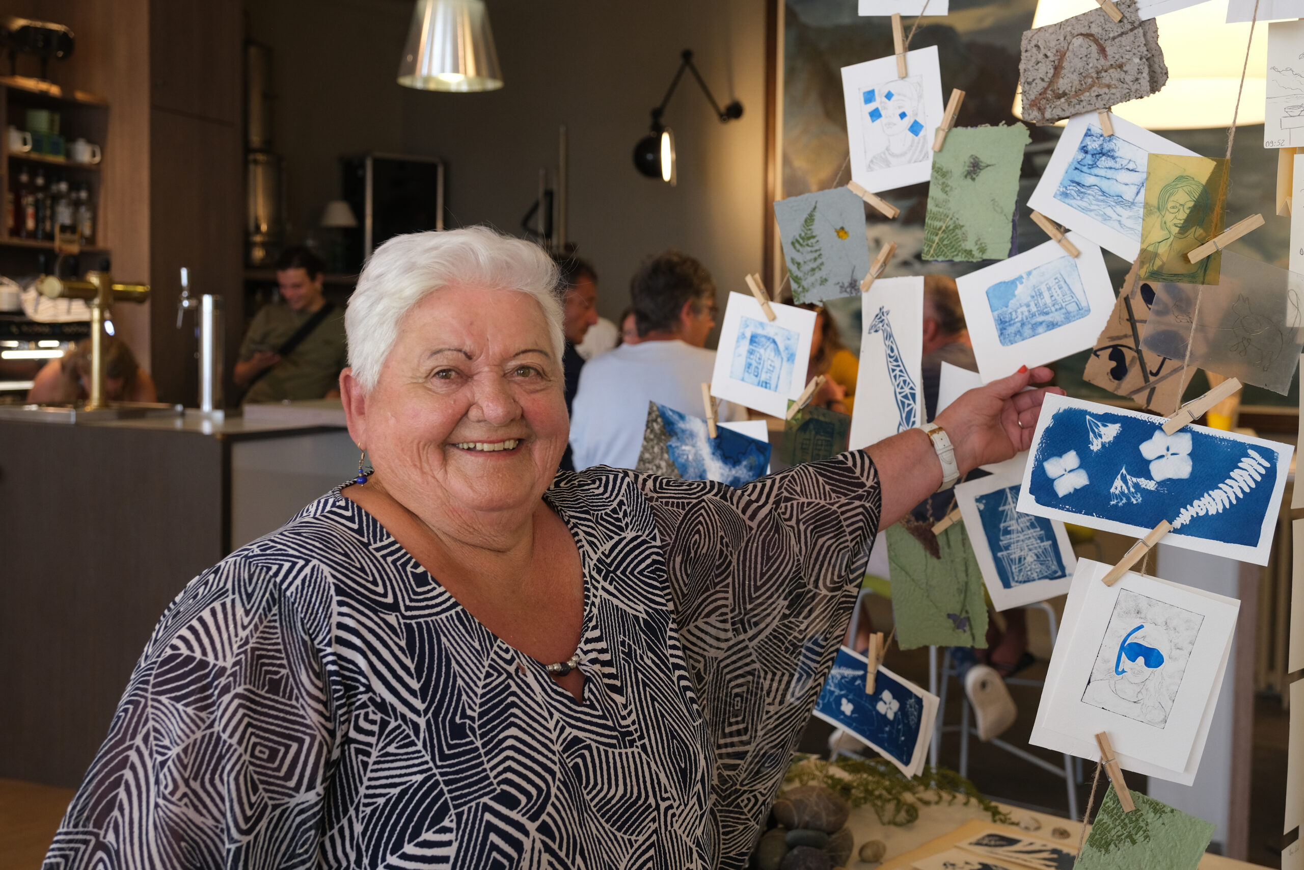 Sarah Alzieu | | 17 octobre 20246 novembre 2024 Compte-rendu des travaux réalisés pendant la semaine: exposition des œuvres au point rencontre; Monique est fière de son travail – © Charles Crié / CCAS