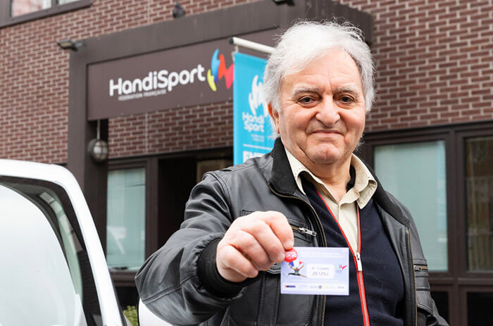Gagnant de la tombola « Gagnons Tokyo », Richard Fautré (ici en compagnie de son épouse, Solange, et d’Emmanuel Salles, président de la Commission Activités physiques et sportives, Loisirs à la CCAS) est venu récupérer son lot au siège de la Fédération française handisport, le 10 février dernier. © Stéphanie Boillon/CCAS