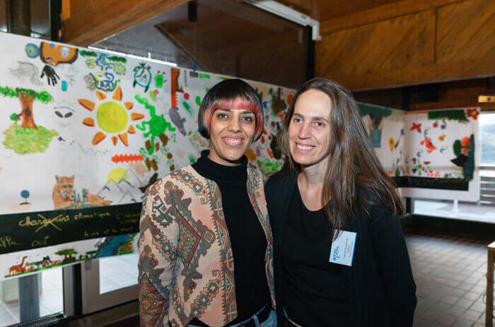 Légende : Hura Mirshekari, artiste en exil, et Sandrine Pareilleux, responsable principale du centre, le jour du vernissage de la fresque collective réalisée durant la résidence artistique au centre de vacances de Savines-le-Lac du 13 au 19 février 2022. ©Stéphanie Boillon/CCAS