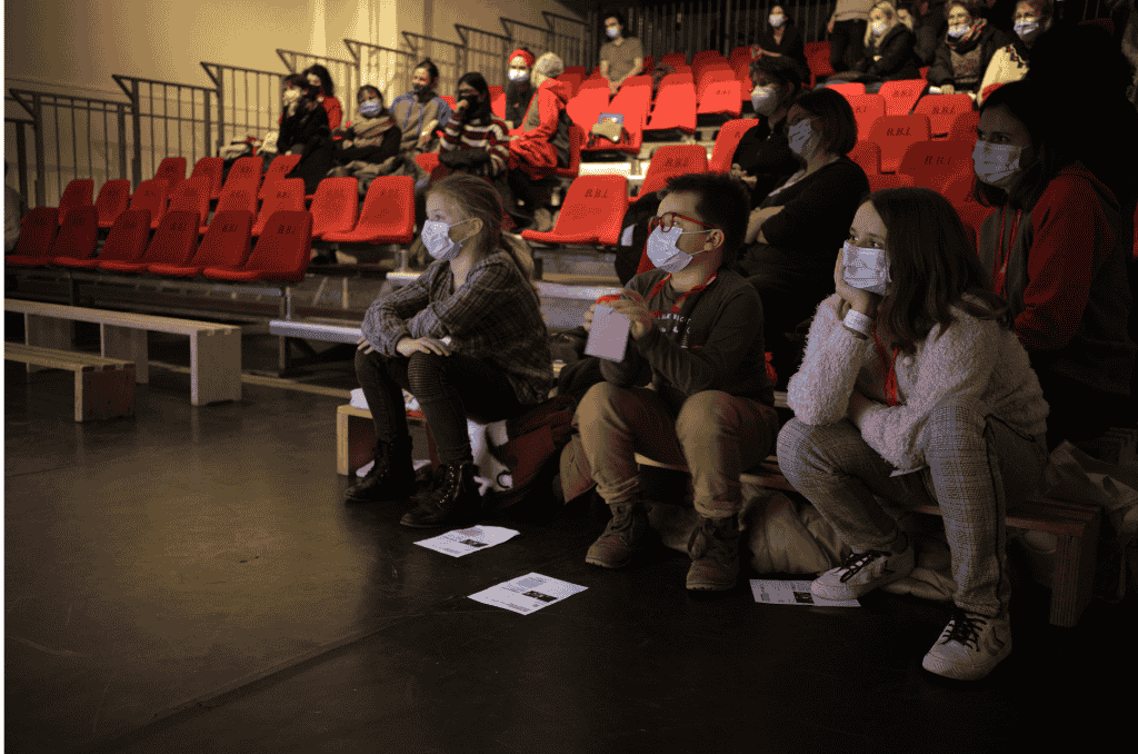 Loïs, Evan et Maêlys en bord de scène , rencontrent les artistes après le spectacle  » Les aventures de Jeff Barel, le dernier iceberg » Cie Firmin et Hector. MOMIX 2022, festival international jeune public. © Charles Crié / CCAS