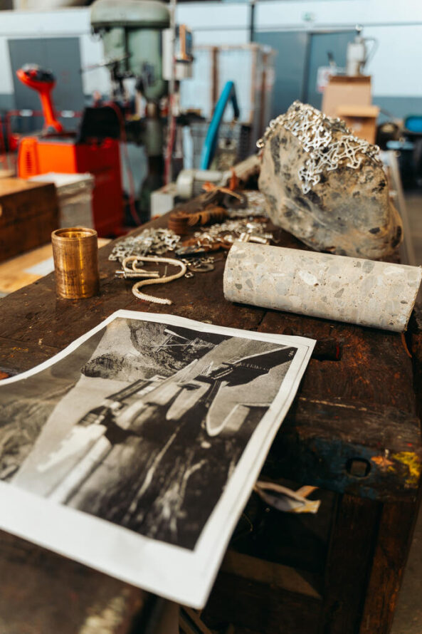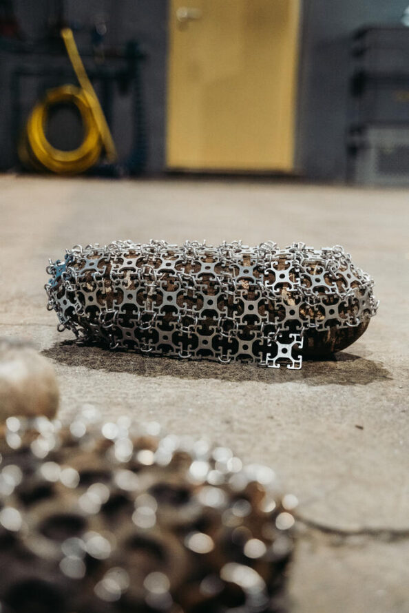 Des sculptures intitulées « Pierres maillées », roches arrondies recouvertes de dentelles métalliques, étaient présentées dans l’atelier de l’usine. C’est dans cet espace que Suska Bastian les a réalisées durant sa résidence, utilisant les instruments et les machines-outils des agents pour travailler le métal.