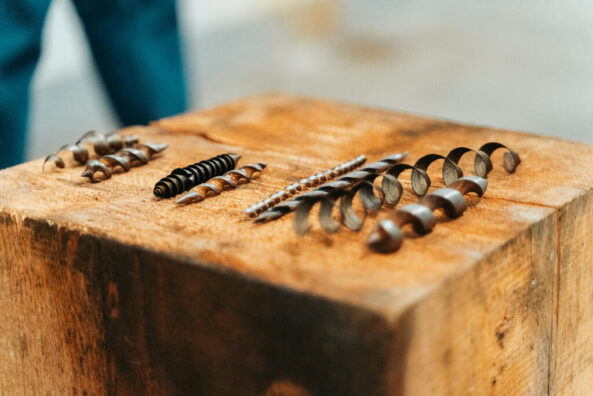 Ce rapprochement renvoie à différentes images, notamment le symbole de la flèche de l’Amour transperçant un cœur. Ces mèches métalliques, Suska Bastian les a glanées dans l’usine, parfois jusque dans la benne : elle a l’habitude de collecter des matériaux dans son environnement direct. Dans d’autres œuvres, elle a utilisé des vieux boulons de toutes tailles ou encore une vieille citerne rouillée.